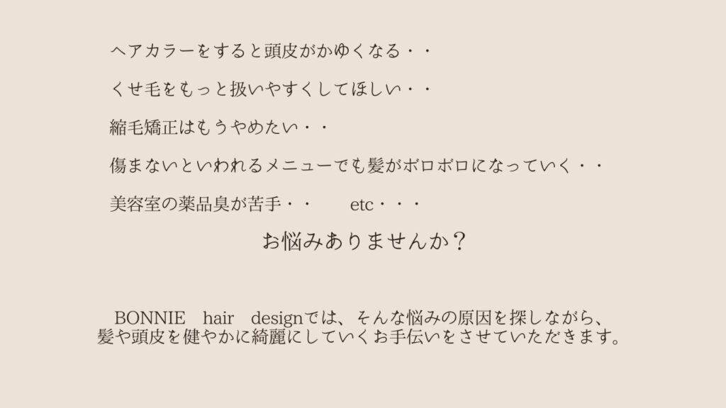 現状のくせ毛が、ヘアカラーやパーマ等によるダメージによって本来のクセよりも扱いづらくなっている場合があります。 その場合はダメージの原因となっていることをやめる、もしくは減らす。 そして髪質を改善するアプローチをしていくと、現状よりもくせ毛が落ち着き、扱いやすいくせ毛に変わっていく方がほとんどです。