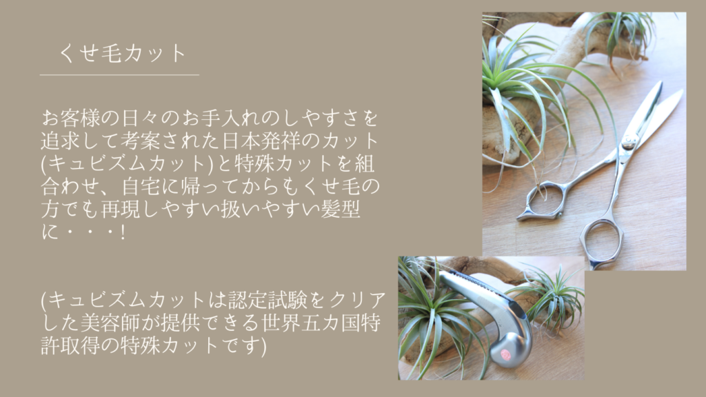 当店のカットは、くせ毛の方もお手入れが楽になるようなカット方法で切らせていただきます。ただし、初回は前回までのカットの影響もあるので、回数を重ねた方が扱いやすさを実感できるかと思います。 また、乾かし方も大事になりますので、ご来店の際にはドライヤーのかけ方やシャンプーの仕方等、日々のお手入れの仕方も説明させていただければと思います。